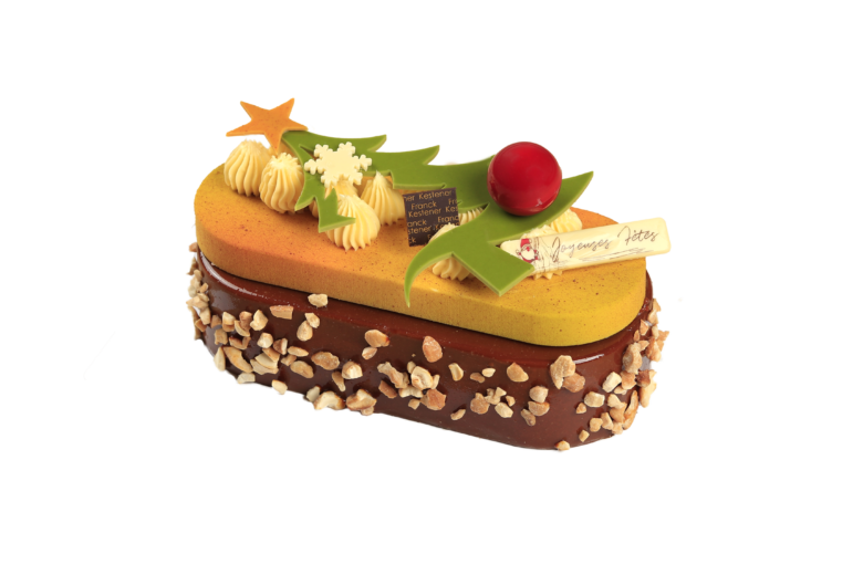 Chantilly chocolat noir, poires caramélisées façon tatin, biscuit pain d’épices, crème légère caramel, biscuit amande et pécan, mousse poire.
