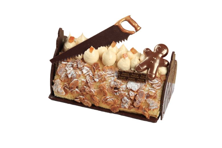 Composition: œuf, farine, sucre, lait, crème, amandes, vanille, orange, pâte de cacao, beurre de cacao, lécithine de soja