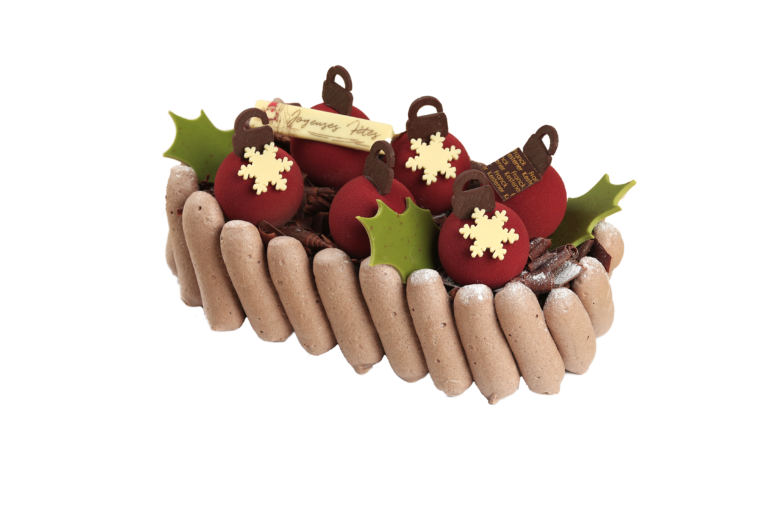 Composition: œuf, farine, sucre, lait, crème, amande, kirsch, griotte confite, stabilisant, tréhalose, gélatine de poisson, poudre de cacao, denrée colorante: rouge (carmin), bleu ( spirulie), jaune ( bêta carotène E160I)pâte de cacao, beurre de cacao, glucose, lécithine de soja